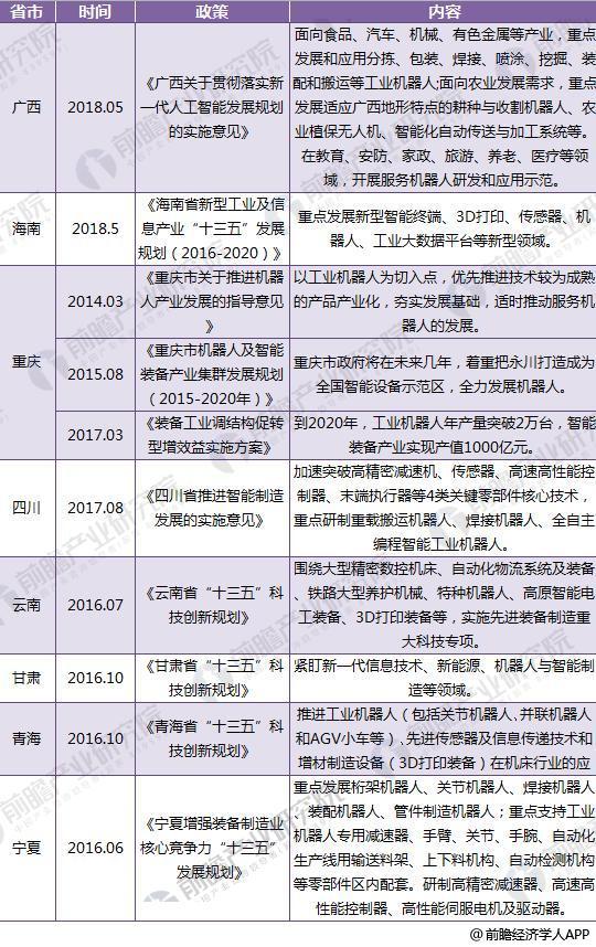 國家政策先行,地方政策迅速跟進:2016年以來,我國各省市圍繞“機器人”發布了多項產業促進政策,尤其是北京、天津、遼寧、上海、浙江等10個省市出臺了機器人相關的產業規劃。
