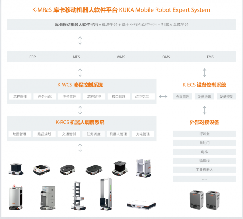 K-MR圖片S軟件平臺(tái)包含K-WCS(流程控制系統(tǒng))、K-RCS(機(jī)器人調(diào)度系統(tǒng))和K-ECS(設(shè)備控制系統(tǒng))三大模塊,可無(wú)縫對(duì)接上層系統(tǒng),數(shù)據(jù)信息獲取,任務(wù)流程編排、多機(jī)器人調(diào)度協(xié)同、外部設(shè)備對(duì)接調(diào)度等功能,實(shí)現(xiàn)工廠制造的自動(dòng)化、智能化和數(shù)字化。