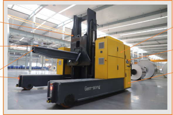 采用叉車式激光導航實現超重載(20噸級+)、無容器、大尺寸、多形狀約束條件下安全防護等級、定位精度、接駁形式等無人化作業...