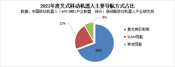 從產(chǎn)品類(lèi)別分布看,2021年,激光有反射板叉車(chē)依舊是市場(chǎng)應(yīng)用主流,占比為69%,其次是SLAM導(dǎo)航無(wú)人叉車(chē),在一些對(duì)機(jī)器人柔性化程度要求高的場(chǎng)景中逐漸滲透,占比為23%。