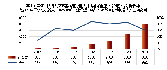 圖表:2015-2021年中國(guó)叉式移動(dòng)機(jī)器人市場(chǎng)銷(xiāo)售量(臺(tái)數(shù))及增長(zhǎng)率