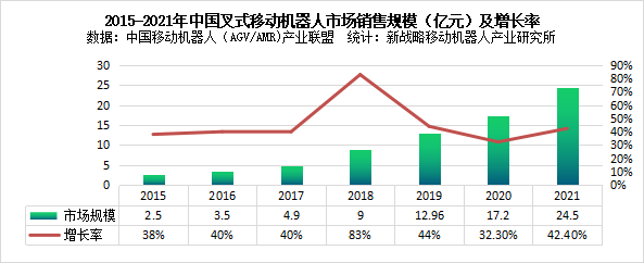 圖表:2015-2021年中國(guó)叉式移動(dòng)機(jī)器人市場(chǎng)銷(xiāo)售規(guī)模(億元)及增長(zhǎng)率