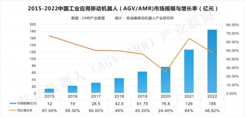 2015-2022中國(guó)工業(yè)應(yīng)用移動(dòng)機(jī)器人(AGV/AMR)市場(chǎng)規(guī)模與增長(zhǎng)率