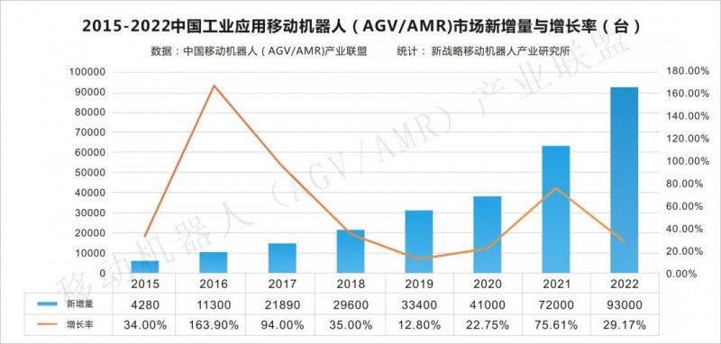 圖表:2015-2022中國工業(yè)應用移動機器人(AGV/AMR)新增量與增長率