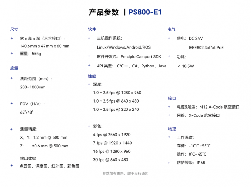 新品PS800-E1即發(fā)布日起正式上線,更多樣品信息及獲取,請聯(lián)系info@percipio.xyz.