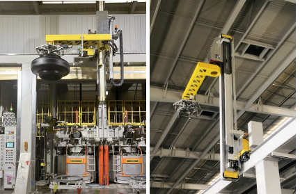 UQI優奇EMS自行小車的軌道布置在高空中,避開了擁擠的地面空間,以機械手從各個成型機收取胎胚。其最高運行速度高達200米/分鐘,可充分滿足大面積廠房的快速輸送需求。