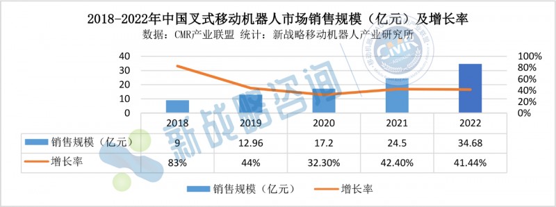 據CMR產業聯盟數據、新戰略移動機器人產業研究所統計,2022年中國叉式移動機器人銷量達13300臺,同比增長66.25%,市場規模約為34.68億元,同比增長41.55%。