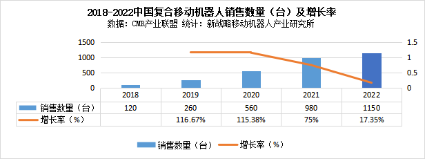 根據(jù)CMR產(chǎn)業(yè)聯(lián)盟數(shù)據(jù),新戰(zhàn)略移動機器人產(chǎn)業(yè)研究所統(tǒng)計, 2022年度中國市場新增復(fù)合移動機器人1150臺,從2018年的120臺到2022超千臺,近年來復(fù)合機器人落地應(yīng)用逐漸增多。