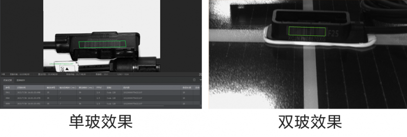 需求:電池片敷設(shè)背板或背玻后,表面會貼附標(biāo)簽碼用于后續(xù)工序的追溯管理,單玻組件貼在背板上,雙玻組件貼在毛玻璃上,需要在組件運(yùn)轉(zhuǎn)過程中讀碼。