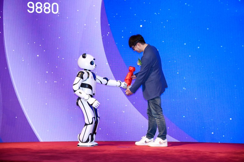 圖片2:熊貓機器人優(yōu)悠將鑼錘遞給優(yōu)必選董事會主席、執(zhí)行董事兼行政總裁周劍
