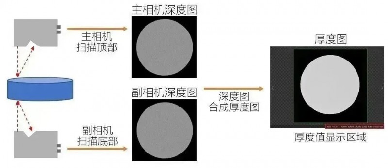 方案優勢:通過雙相機對射拼接掃的方式描圓柱體兩個面,輸出圓柱體“厚度”圖像(兩張深度圖差分形成),在“厚度”圖像中可直接顯示圓柱體任意點位的厚度值,以及兩個平面的3D數據