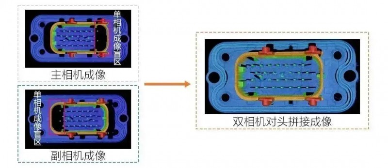 方案優勢:通過雙相機對頭拼接的方式消除連接器側壁導致的盲區,單次掃描出圖即可進行pin針位置度檢測