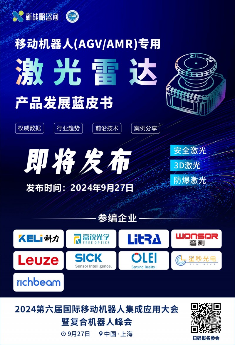 為了探析激光雷達(dá)在移動(dòng)機(jī)器人領(lǐng)域的應(yīng)用現(xiàn)在及趨勢(shì),9月27日,由CMR產(chǎn)業(yè)聯(lián)盟主編,科力光電、富銳光學(xué)、力策科技、勞易測(cè)、歐鐳激光、西克、星秒光電、銳馳智光、灣測(cè)技術(shù)等企業(yè)聯(lián)合參與的《移動(dòng)機(jī)器人(AGV/AMR)專用激光雷達(dá)產(chǎn)品發(fā)展藍(lán)皮書》將在“第6屆國(guó)際移動(dòng)機(jī)器人集成應(yīng)用大會(huì)暨復(fù)合機(jī)器人峰會(huì)”上正式發(fā)布,敬請(qǐng)期待!