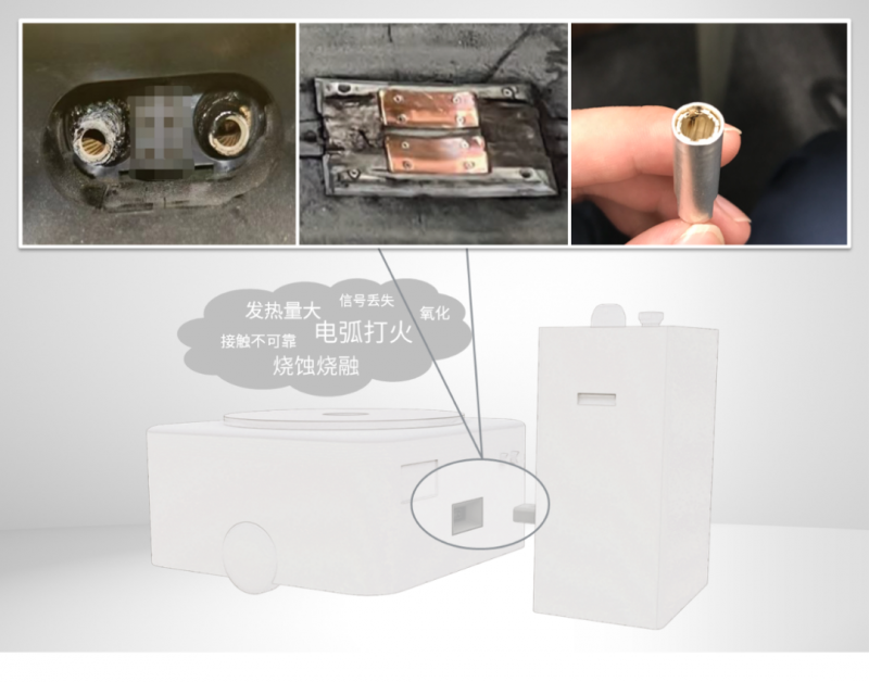 移動(dòng)機(jī)器人(AGV/AMR)與穿梭車(chē)等自動(dòng)化物流設(shè)備需要頻繁充電來(lái)實(shí)現(xiàn)高效運(yùn)轉(zhuǎn),因此充電環(huán)節(jié)成為潛在風(fēng)險(xiǎn)點(diǎn)。全球知名工商業(yè)保險(xiǎn)公司 FM Global 在財(cái)產(chǎn)防損數(shù)據(jù)冊(cè)《8-34 Protection for Automatic Storage and Retrieval Systems》中強(qiáng)調(diào),AS/RS 系統(tǒng)的安全防護(hù)要著重防范充電接觸點(diǎn)出現(xiàn)電弧發(fā)熱等風(fēng)險(xiǎn)。移動(dòng)機(jī)器人頻繁充電時(shí),若充電連接器無(wú)法適應(yīng)高插拔工況,隨著插拔次數(shù)增加,連接器表面磨損加劇,鍍層和基材受損,接觸電阻上升。磨損到一定程度發(fā)生接觸失效,接觸電阻會(huì)急劇增大,引發(fā)高溫發(fā)熱,帶來(lái)電氣安全風(fēng)險(xiǎn)。在終端現(xiàn)場(chǎng),充電故障常表現(xiàn)為無(wú)法充電、電弧打火、連接器燒毀等,這不僅降低物流效率,還帶來(lái)重大安全隱患。在鋰電、光伏、半導(dǎo)體等火災(zāi)防控要求極高的行業(yè),這類(lèi)故障必須嚴(yán)格防范,否則極易引發(fā)嚴(yán)重后果。
