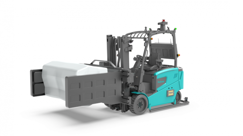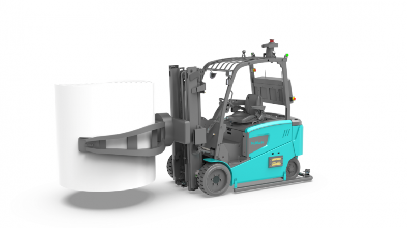 勱微E系列平衡重式無人叉車搭載弧形自適應夾具,夾緊物料后可連續(xù)360°旋轉,便于交換作業(yè),廣泛用于造紙、紙箱、包裝、印刷等行業(yè)無托盤搬運。