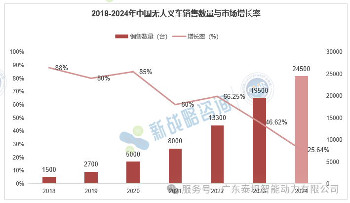 2024年,中國(guó)無(wú)人叉車(chē)市場(chǎng)交出了一份亮眼答卷——根據(jù)移動(dòng)機(jī)器人產(chǎn)業(yè)聯(lián)盟數(shù)據(jù)顯示,2024年,中國(guó)市場(chǎng)無(wú)人叉車(chē)全年銷(xiāo)量達(dá)24,500臺(tái),同比增長(zhǎng)25.64%,在移動(dòng)機(jī)器人整體市場(chǎng)中銷(xiāo)售占比為17.63%,成為移動(dòng)機(jī)器人領(lǐng)域增長(zhǎng)最快的細(xì)分賽道之一。