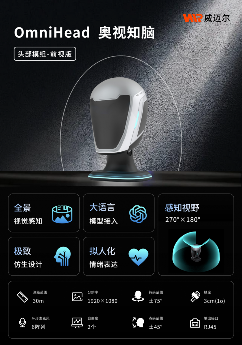 作為藍(lán)芯科技全資子公司,威邁爾科技依托在移動(dòng)機(jī)器人領(lǐng)域多年的技術(shù)沉淀,將工業(yè)級(jí)感知能力下沉至人形機(jī)器人賽道,推出頭部模組OmniHead。該模組以多模態(tài)融合感知為核心、開(kāi)放系統(tǒng)為支撐,不僅補(bǔ)齊當(dāng)前人形機(jī)器人在感知維度完整性與認(rèn)知決策深度上的關(guān)鍵短板,更構(gòu)建了可擴(kuò)展、高兼容的感知基座,為具身智能規(guī)模化落地奠定基礎(chǔ)。