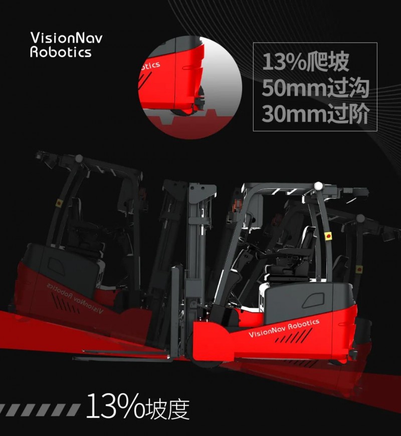 VNP20裝載了450mm的高耐磨實(shí)心橡膠輪,實(shí)現(xiàn)13%最大坡度、50mm最大過溝寬度以及30mm最大過階高度的越障能力,輕松應(yīng)對外月臺、室外等高速、高負(fù)載作業(yè)工況。