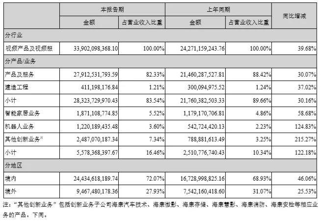 報(bào)告中主要營業(yè)收入組成如下,創(chuàng)新業(yè)務(wù)和機(jī)器人業(yè)務(wù)增長迅速,表現(xiàn)非凡。其中,海康機(jī)器人實(shí)現(xiàn)營收12.2億,同比增長124.83%。