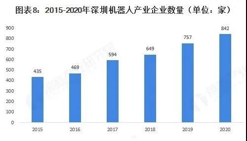 近年來,深圳機(jī)器人產(chǎn)業(yè)規(guī)模愈發(fā)龐大,2020年深圳市機(jī)器人產(chǎn)業(yè)總產(chǎn)值為1434億元,較2019年的1257億元增長14.08%,產(chǎn)值增速顯著回升,回歸發(fā)展快車道。深圳市機(jī)器人企業(yè)總數(shù)量達(dá)842家,較2019年的757家增長11.23%。