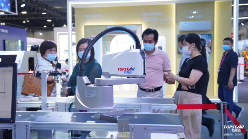 在展覽現(xiàn)場,拓斯達的五軸聯(lián)動數(shù)控機床和機器人視覺跟隨抓取和檢測系統(tǒng)吸引了許多觀眾和參展商的廣泛關(guān)注。