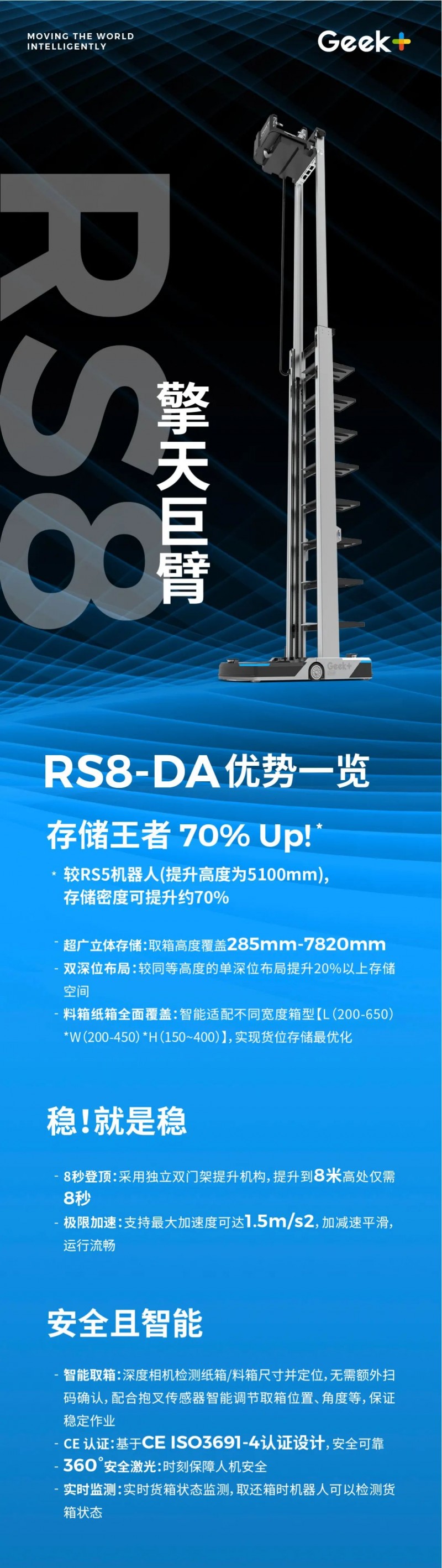 全球AMR引領(lǐng)者極智嘉(Geek+)今日重磅發(fā)布一款最大提升高度達8145mm的全新貨箱機器人RS8,刷新業(yè)內(nèi)貨箱機器人高度極限!該機器人取箱高度范圍覆蓋從285mm至7820mm,實現(xiàn)超廣立體存儲。相比RS5機器人(提升高度為5100mm),RS8的存儲密度可提升約70%,再創(chuàng)貨箱到人高密度存儲天花板。