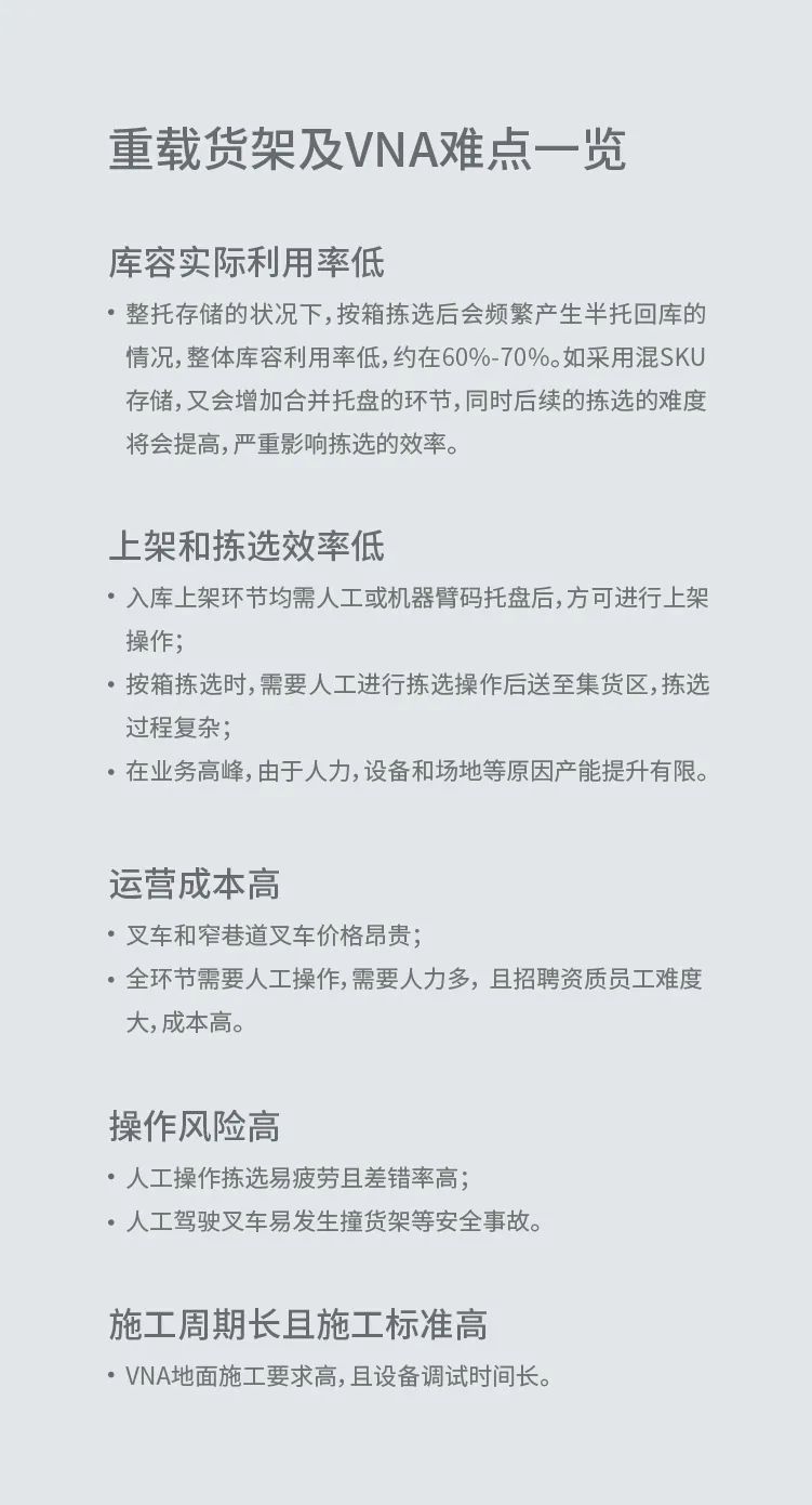 RS8-DA貨箱機器人主打服裝行業(yè)整箱存取場景,目前,該場景大多采用重載貨架配合人工叉車進行揀選,而這種形式多面臨以下難點: