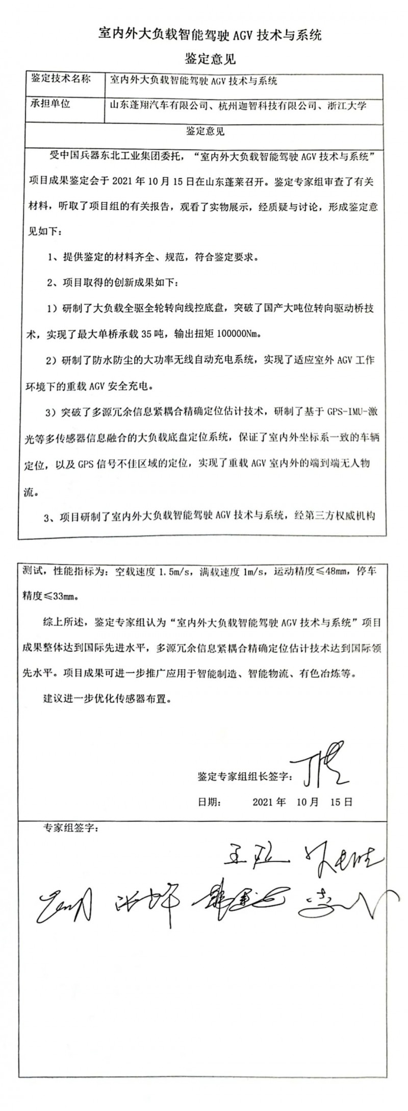 10月15日,由中國兵器集團民品發(fā)展部、東北工業(yè)集團、山東蓬翔汽車有限公司、杭州迦智科技有限公司主辦,煙臺市蓬萊區(qū)人民政府、中國移動機器人(AGV/AMR)產業(yè)聯(lián)盟協(xié)辦的“蓬翔重載AGV產品鑒定大會”及“蓬翔汽車室內外重載