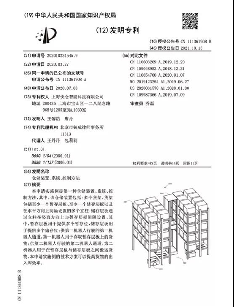 快倉Quick Pick方案以其先進性和創新性獲得了行業內外的一直認可,2021年10月15日快倉QuickPick發明專利獲得正式授權!