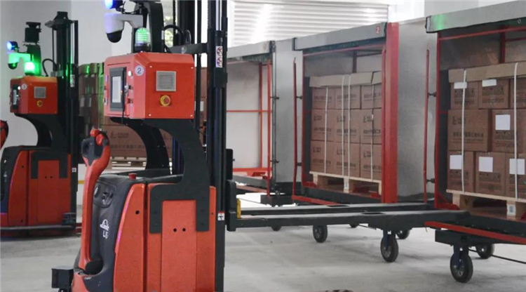 在生產(chǎn)系統(tǒng)的任務(wù)下,AGVS調(diào)度系統(tǒng)與WCS、WMS實時通訊,智能調(diào)度復雜場景不同車型之間的交互配合。戶外牽引AGV完成前端物流配送后,無人叉車聯(lián)動叉取在戶外牽引AGV料架上的貨物,并與立體倉庫中的輥筒線系統(tǒng)對接完成貨物到輥筒線上的碼放動作,隨后堆垛機接收系統(tǒng)指令,完成一拖物料的入庫數(shù)據(jù)鏈。出庫至發(fā)貨環(huán)節(jié)上,再由無人叉車完成最后一公里的搬運任務(wù)并實時反饋工作狀態(tài)至系統(tǒng)存儲分析,即“無人”物流閉環(huán)模式成型。