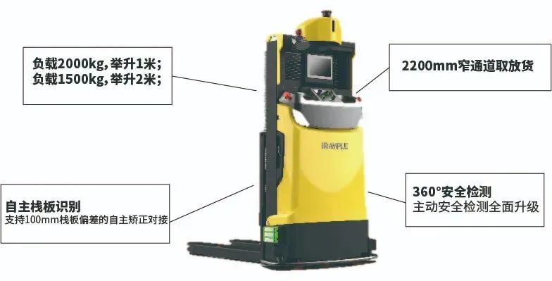 華睿科技推出F150A系列窄通道叉取型AMR。F150A系列叉取型AMR基于窄體車身設(shè)計(jì),可以在2200mm通道內(nèi)將最大2000kg貨物堆高1米,滿足窄通道內(nèi)的大負(fù)載搬運(yùn)和機(jī)臺(tái)對(duì)接作業(yè)。也可以將1500kg貨物堆高至2米,滿足貨物的轉(zhuǎn)運(yùn)和上架存儲(chǔ)。