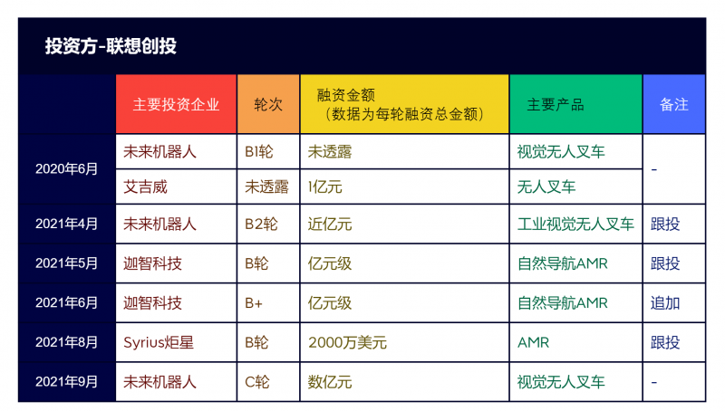 2020年至2021年,聯想創投在移動機器人行業參與了7起融資事件,被投企業包括未來機器人、艾吉威、迦智科技、Syrius炬星。