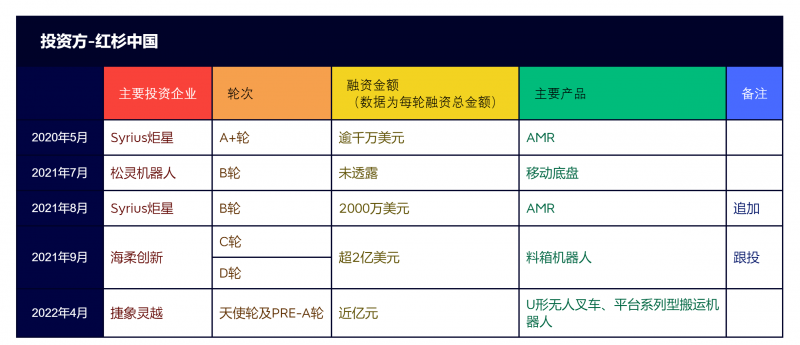 2020年以來,紅杉中國在工業應用移動機器人行業中共參與了6起融資事件,被投企業主要產品覆蓋了移動機器人的移動底盤、無人叉車以及AMR等,企業專注市場領域從海內囊括到海外,包括上文提及的“海歸”Syrius炬星、專注于“箱式倉儲機器人”的海柔創新,以及“移動底盤專家”松靈機器人和“打破傳統叉車固化設計”捷象靈越。