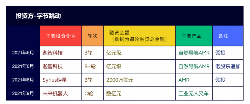 在移動機器人行業內,字節跳動去年一年參投了迦智科技、Syrius炬星和未來機器人3家企業。
