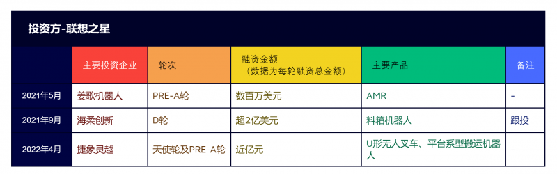 近兩年,聯想之星在工業移動機器人領域投資了三家企業,包括箱式倉儲機器人科技企業海柔創新、機器人通用底盤松靈機器人、AMR機器人公司姜歌機器人,基本上都是從天使輪開始切入。