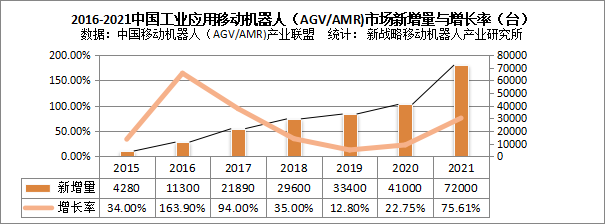 圖表:2015-2021中國(guó)市場(chǎng)企業(yè)工業(yè)應(yīng)用移動(dòng)機(jī)器人(AGV/AMR)新增量(臺(tái))與增長(zhǎng)率