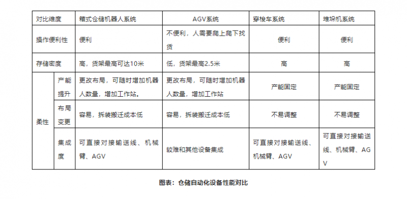 在3PL及電商倉儲中,當前主要有4類自動化解決方案,箱式倉儲機器人/AGV系統/穿梭車系統/堆垛機系統,四類方案各有其優劣勢。